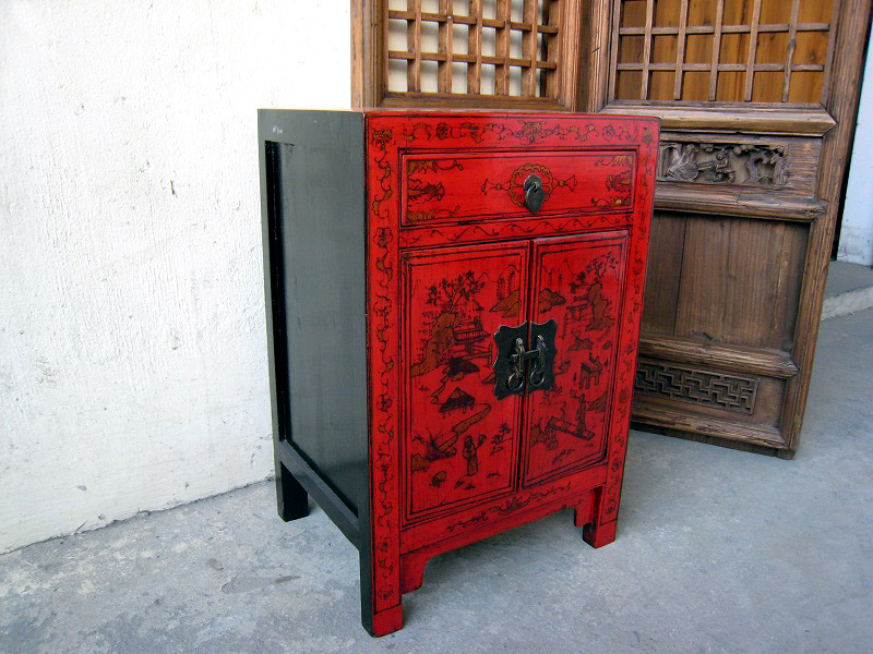 ◆シノワズリ スタイル キャビネット 【朱塗山水図一抽斗小箪笥】 ------------------------------------------ シノワズリスタイルに抜群の朱塗キャビネットです。上に壷を飾るのもよいですしランプを置いて演出するもの魅力的です。引き出しと扉もついて収納しやすい実用性高いキャビネットはいかがでしょうか。