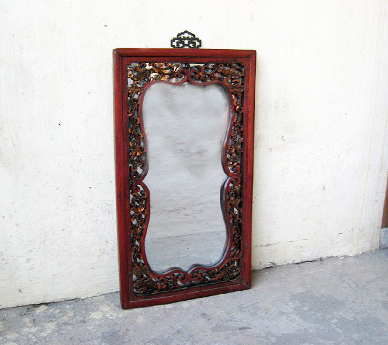 | ■古い木彫装飾のミラー【清朝木彫装飾金襴唐草長方形鏡】